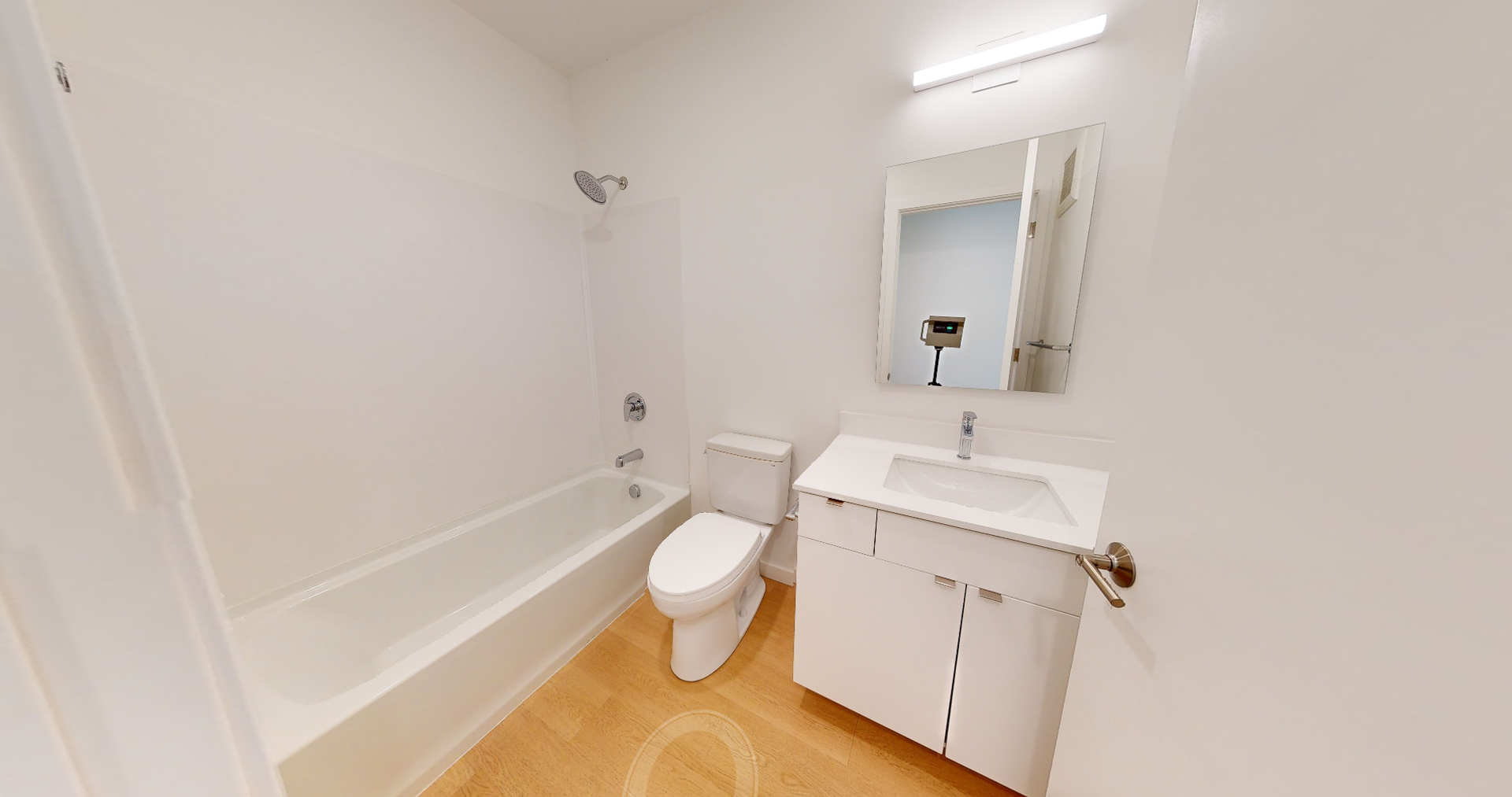 The spacious bedroom offers a cozy sanctuary with room for a king-sized bed, a large closet, and a calming design palette that encourages deep rest. Just steps away, the modern bathroom features clean lines, a full tub/shower, and soft lighting that makes every morning feel a little more luxurious. And yes, there’s a full-sized washer and dryer discreetly tucked into the hallway—because convenience matters.