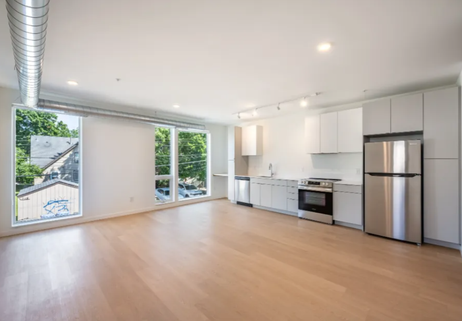 The kitchen flows effortlessly into the dining and living areas, anchored by contemporary finishes and smart functionality. From the polished cabinetry and open shelving to the stainless steel gas range and full-size fridge, it’s built for both performance and style. A dedicated bar-height counter space doubles as the perfect work-from-home nook or espresso bar, depending on the time of day.